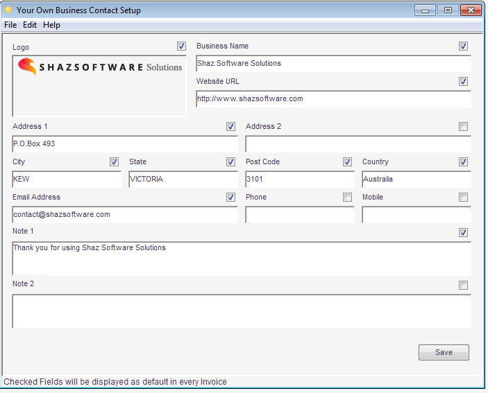 Business Contact Setup screen is where you can add and update your own Business Contact details to be displayed in any Invoice that you will create.
