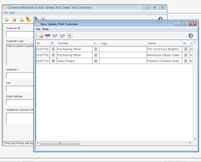 - Above all text boxes beside Additional Customer Information and Customer Logo there is a Checkbox (image 1). You can set a Contact Address for a Customer to be displayed in any of 20 invoices by selecting each field check box for that field to be added to Customer address. (click here for example)