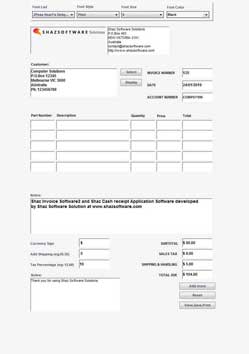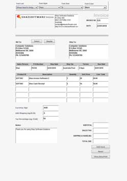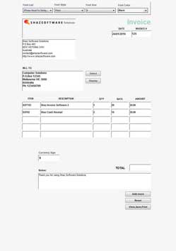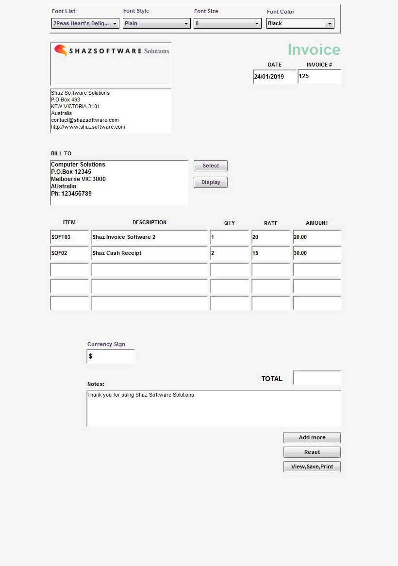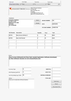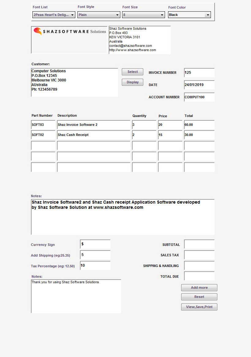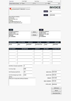 - Type in values in Currency Sign, Add Shipping, Tax Percentage boxes to be calculated and added to final Total before pressing the View,Save,Print button.