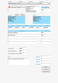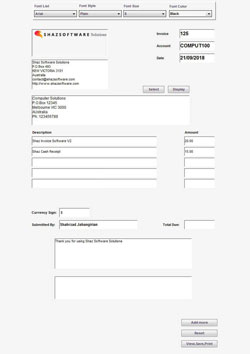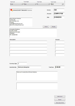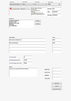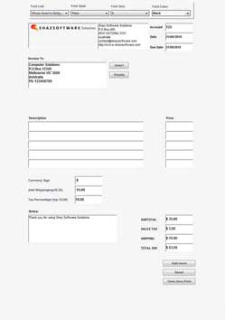 - Type in values in Currency Sign, Add Shipping, Tax Percentage boxes to be added and calculated to final Total before pressing the View,Save,Print button.