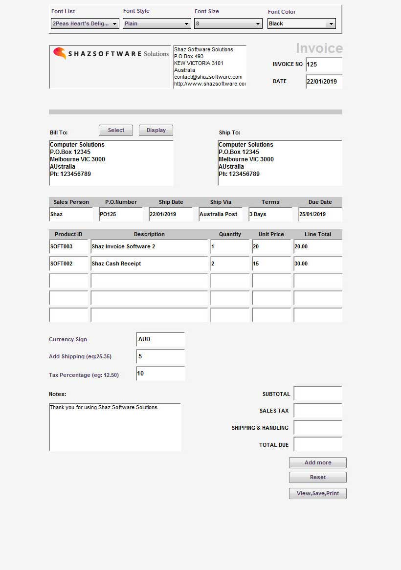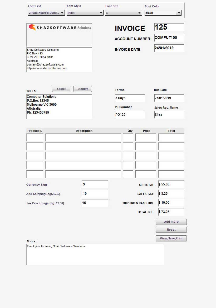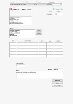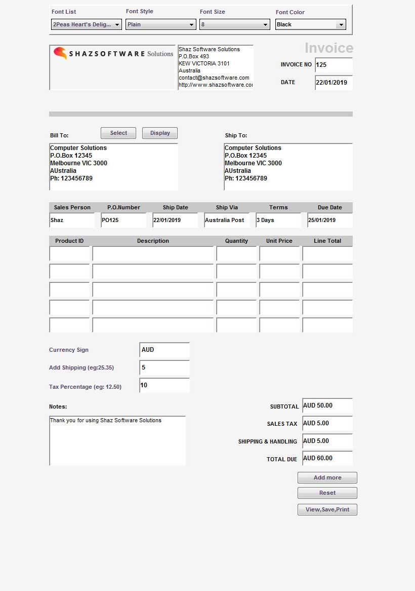 - Type in values in Currency Sign, Add Shipping, Tax Percentage boxes to be calculated and added to final Total before pressing the View,Save,Print button.