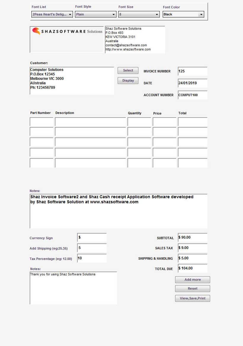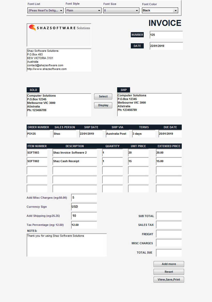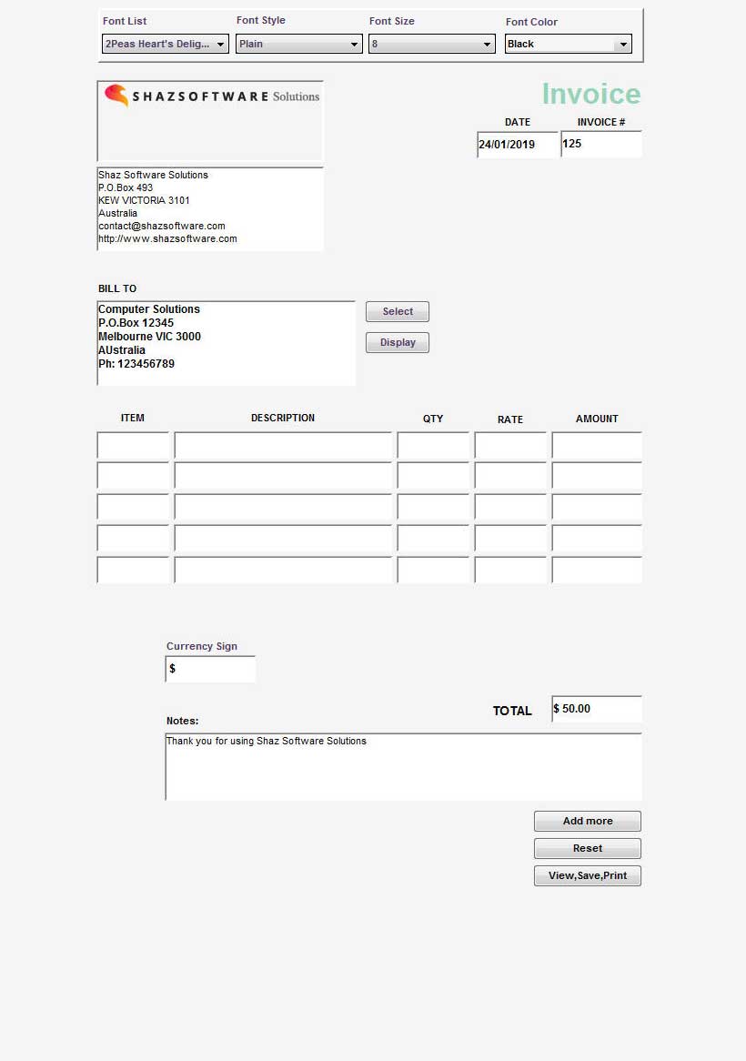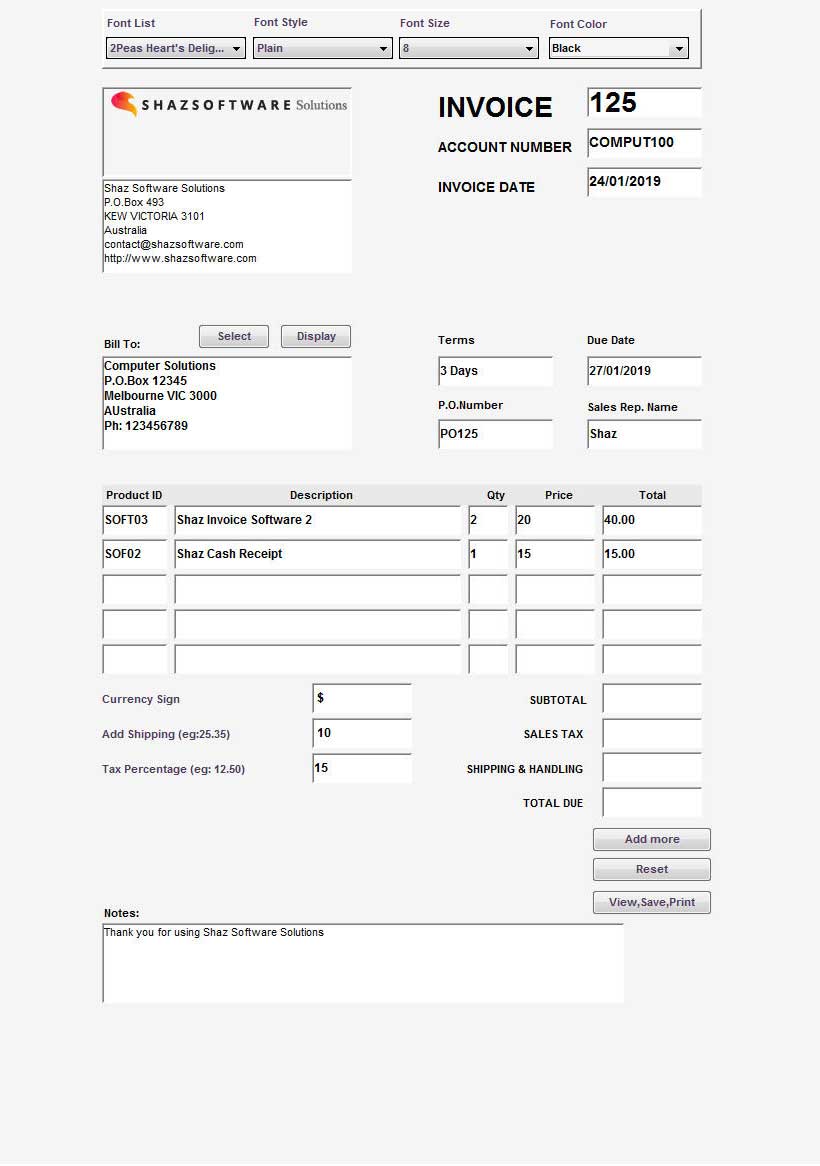 - Type in values in Currency Sign, Add Shipping, Tax Percentage boxes to be calculated and added to final Total before pressing the View,Save,Print button.
